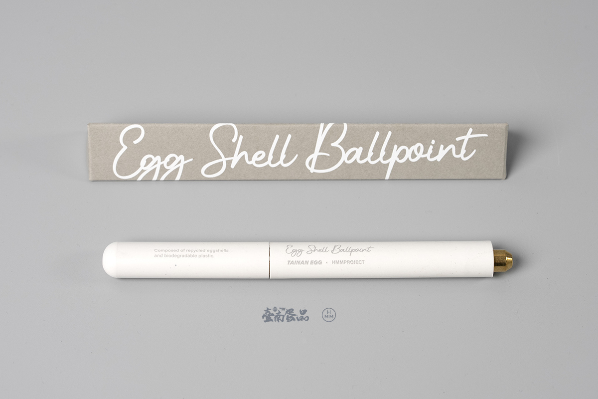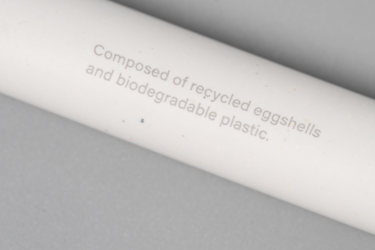 採用回收蛋殼粉複合可生物分解塑料PBAT,筆身表面平滑,但視覺上在表面保留了細微磨碎的蛋殼質點,質地特殊,每一支筆的紋理皆不同,保留最真實的土地溫度。