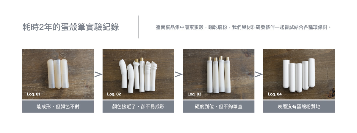 在開發過程中,我們挑戰完全不使用傳統塑料。歷時好幾次混料實驗,才找到將回收蛋殼粉與 PBAT 環保材料完美融合的比例,終於在顯色、硬度、質地上,都符合我們的想像。它不僅擁有一般原子筆缺乏的「天然溫潤手感」,更具備足以陪伴你數年的耐用韌性。