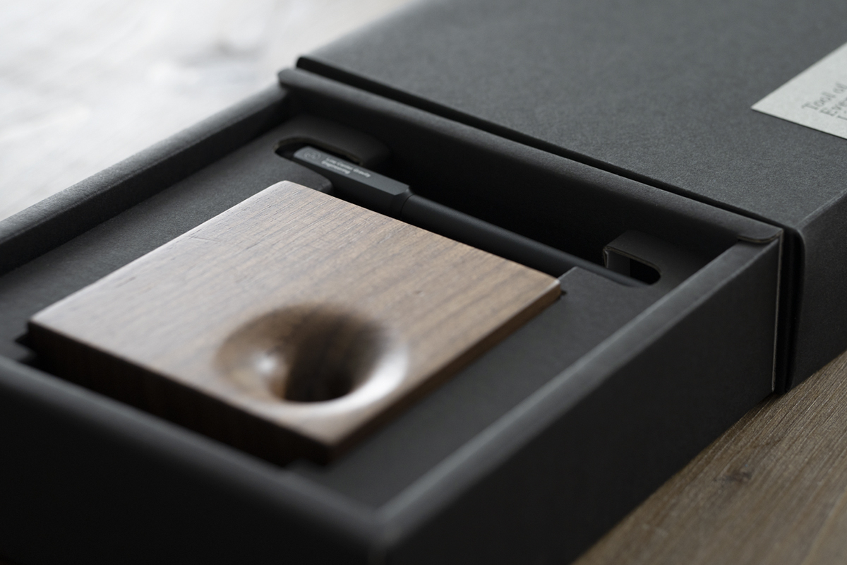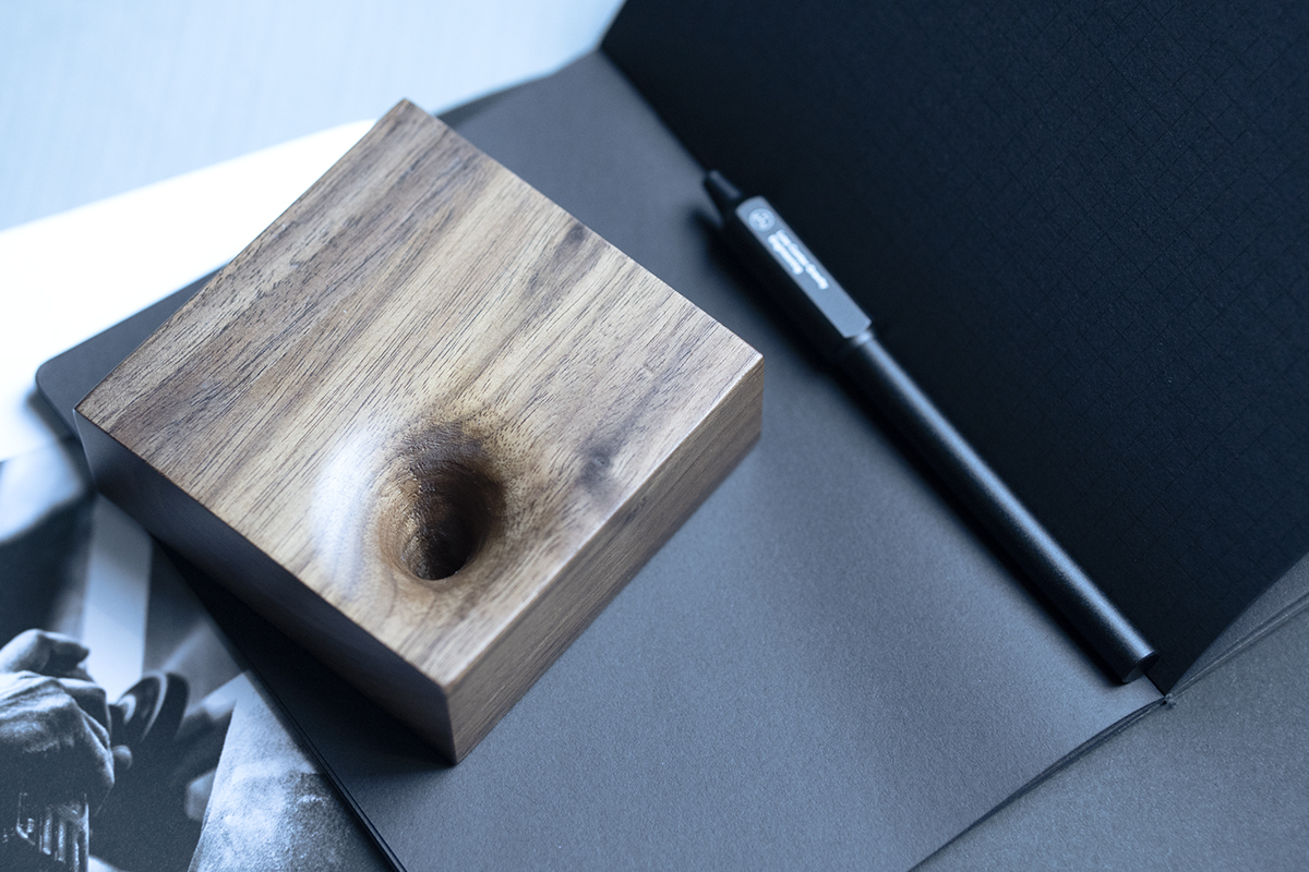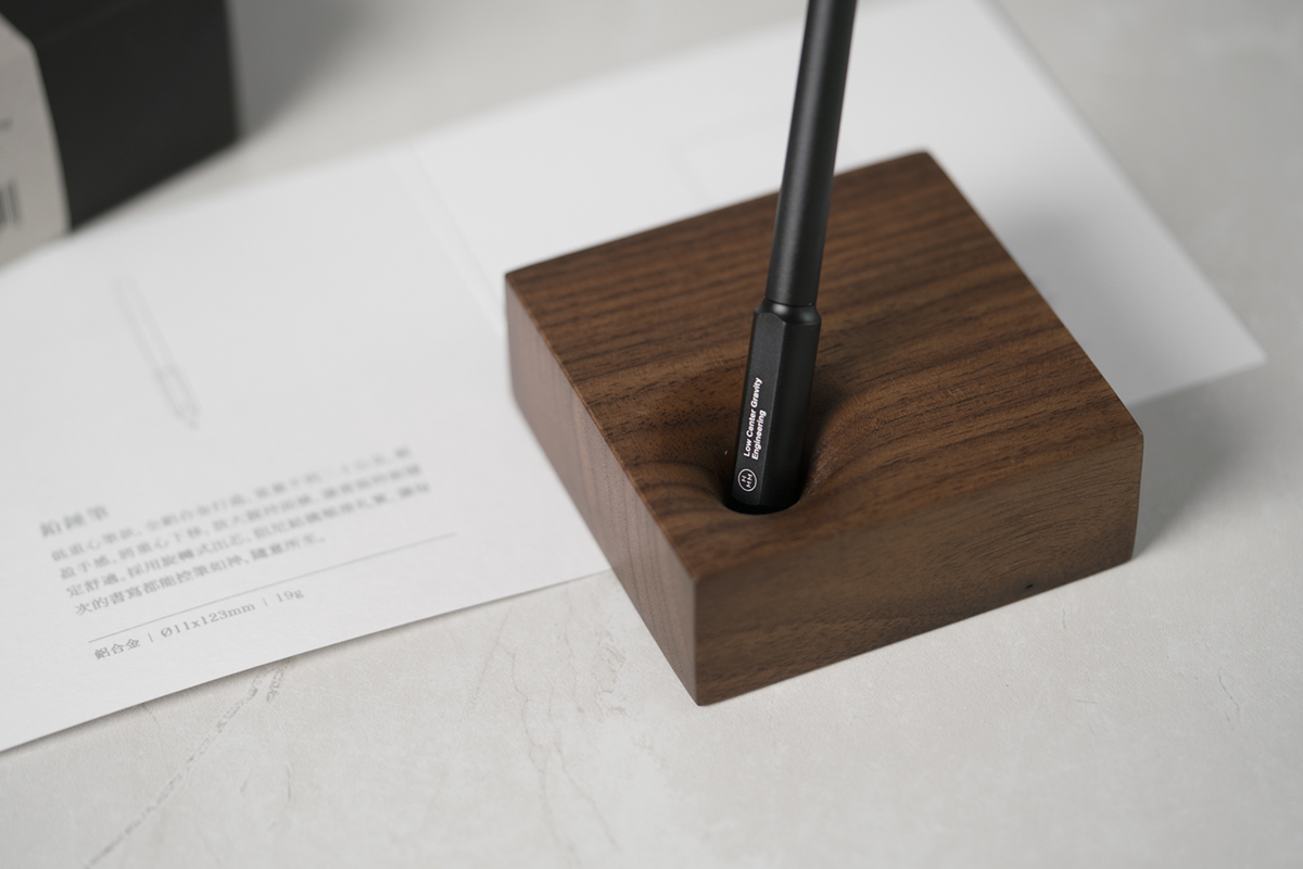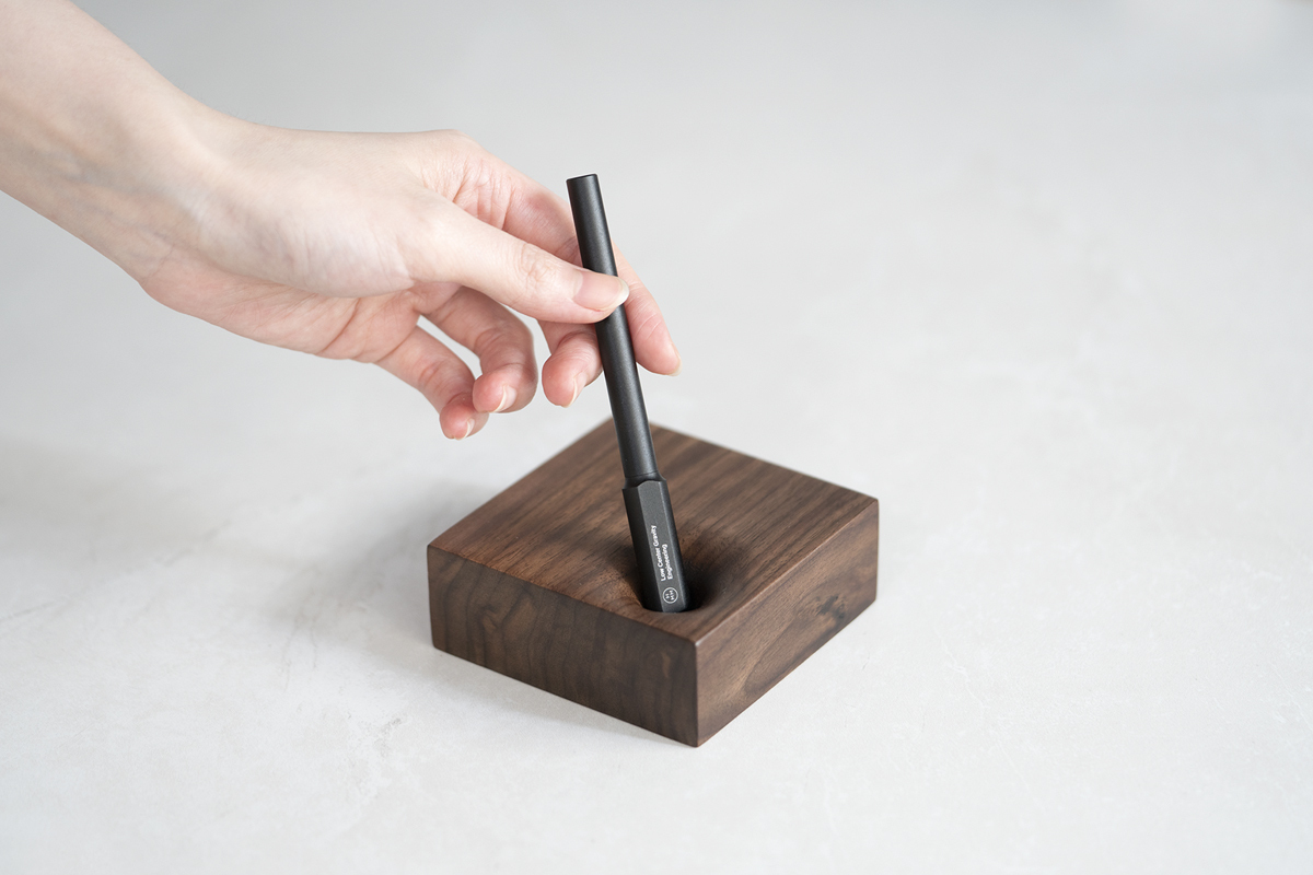 木質底座以85mm X85mm的胡桃木塊為基底,以特殊角度琢磨出圓弧筆座孔洞,即使隨意擺放,細長的筆身也可自然旋入孔洞,以優雅斜度安放,為居家生活與辦公環境增添氣氛。